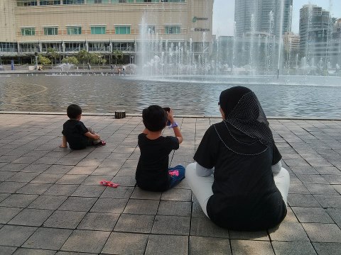 | Sementara hari belum panas, lepak2 dulu depan KLCC tengok air pancut. Btw kitorang sekeluarga pakai baju Korea yg abah beli hari tu. POYO je! kihkihkih |